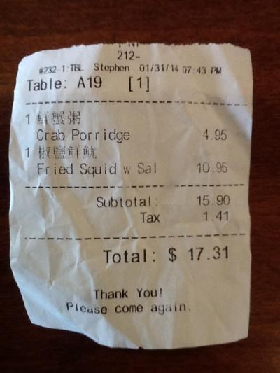 お粥専門店なのでお粥の種類は豊富なのですが、私がお勧めなのは殻ごと入った鮮蟹粥(Crab Porridge)です。蟹の殻に蟹の卵もたっぷりと付いていて絶品でした。お値段も$4.95とお手頃プライス!!NYの寒い冬に体が温まる美味しいお粥でした。