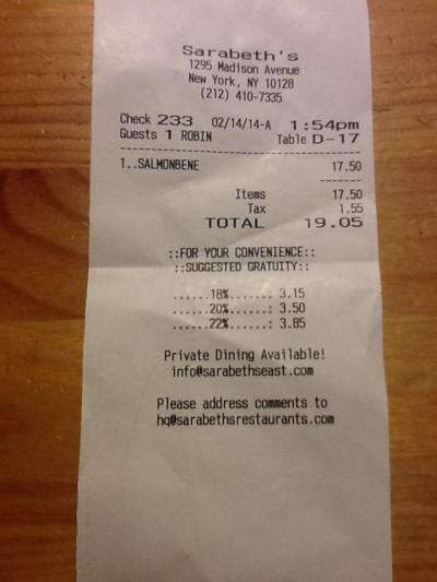 場所は高級住宅地のアッパーイーストにあります。私が行った、金曜日の昼過ぎは混んでもなく空いてもなくすぐに席に通されました。偶々かもしれませんが、私とウエイター以外は近所に住んでいるのであろうラフな服装の白人客だらけで、地域密着型的な感じでした。