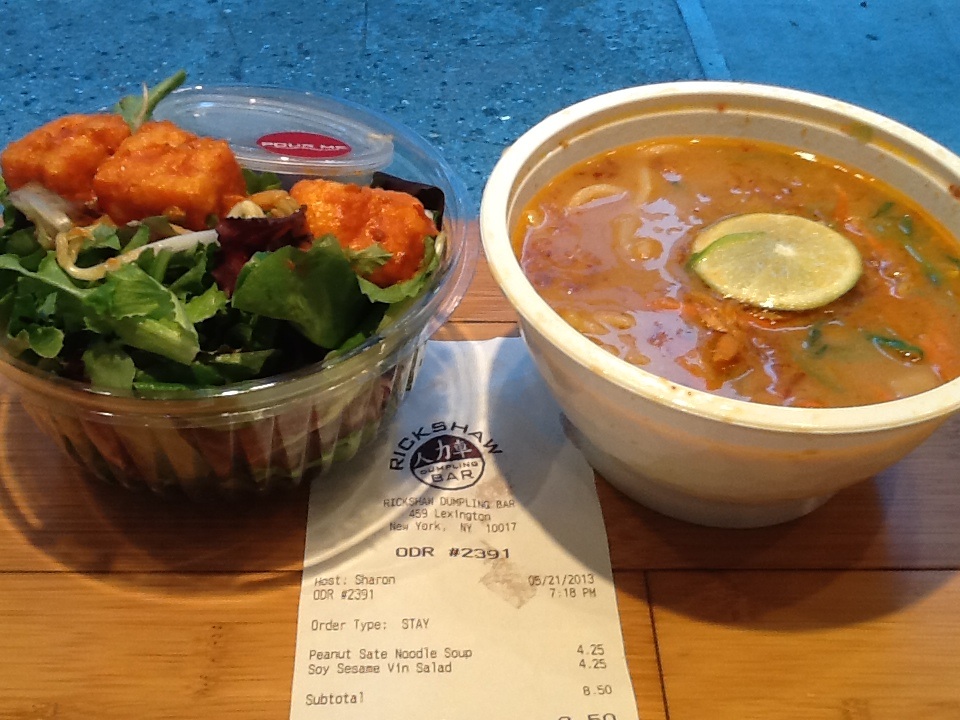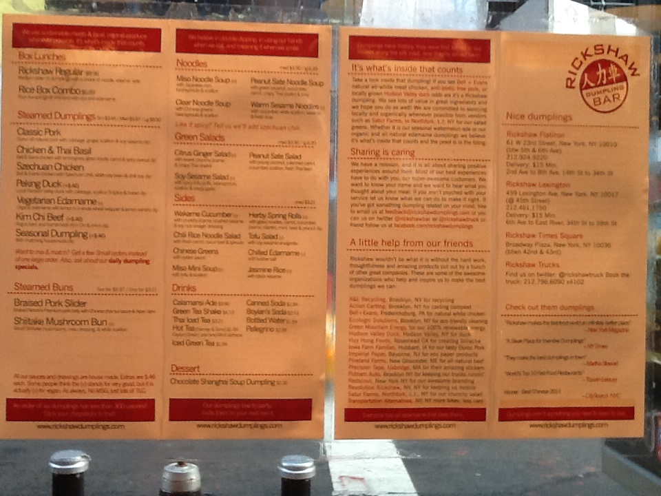 場所はグランドセントラル駅から徒歩で5分位の45th stにあります。餃子がメインのお店ですが、私は今回は餃子を食べずにココナッツ風味の麺と豆腐のサラダを食べました。餃子と言うと中華料理屋さんだと思う方もいらっしゃると思いますが、このお店はアメリカンナイズされたアジアンファーストフードって感じです。店員さんや作っている人達も中国人ではなく、ヒスパニック系の人とネイティブの人達でした。マンハッタン内にこのお店の屋台の車も出ているので人力車の屋台に遭遇するかもしれません。
