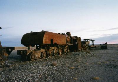 ボリビア、塩湖のあるウユニの町外れに列車の墓場があります。