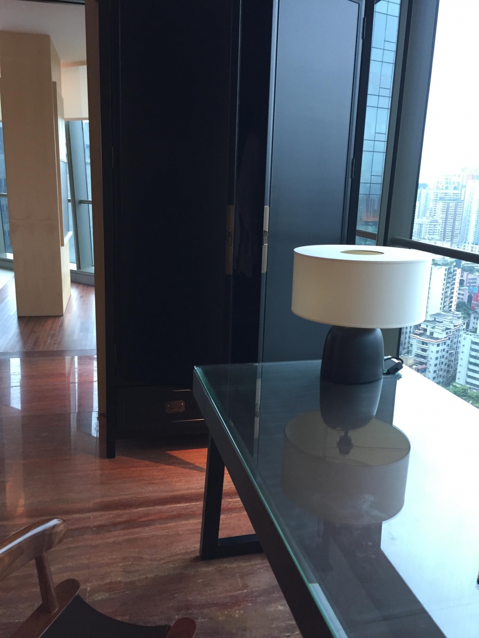 広州、白雲空港から地下鉄で1時間弱で石牌橋駅に着き、駅からショッピングモールを抜け2,3分でホテルにつきます。天河地区の新市街にあり非常に便利で買い物や飲食には最高の立地です。ホテルはエキゾチックな雰囲気でロビーも高級感にあふれています。部屋は120平米もあるスイートでリビング、ベッドルーム、書斎、バスルームと長い廊下で結ばれ、トイレ、シャワー、バスタブは完全に分かれていて使いやすかったです。
