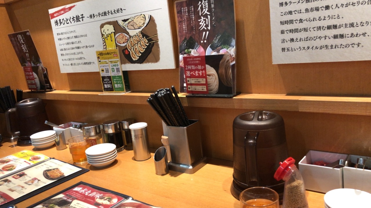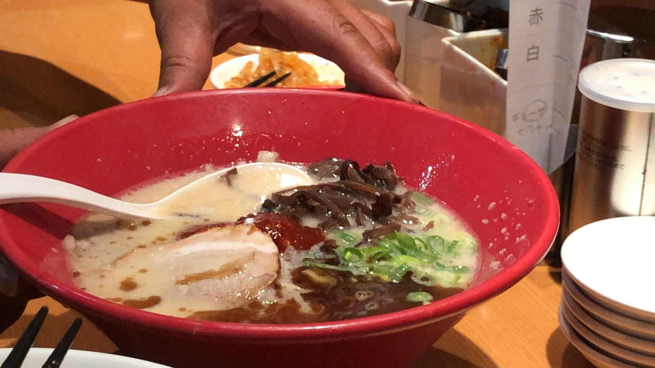 夫は赤、息子は白、そして私は餃子のみを注文しました。赤、白ともスープを飲ませてもらいましたが辛さ全然違いました。替え玉もすぐに来て、滞在時間はたった20分ほどだったと思います。餃子はとても小さく女性向けです。餃子のお代わりをするほど食べやすいものでした。甘みも好みでした。