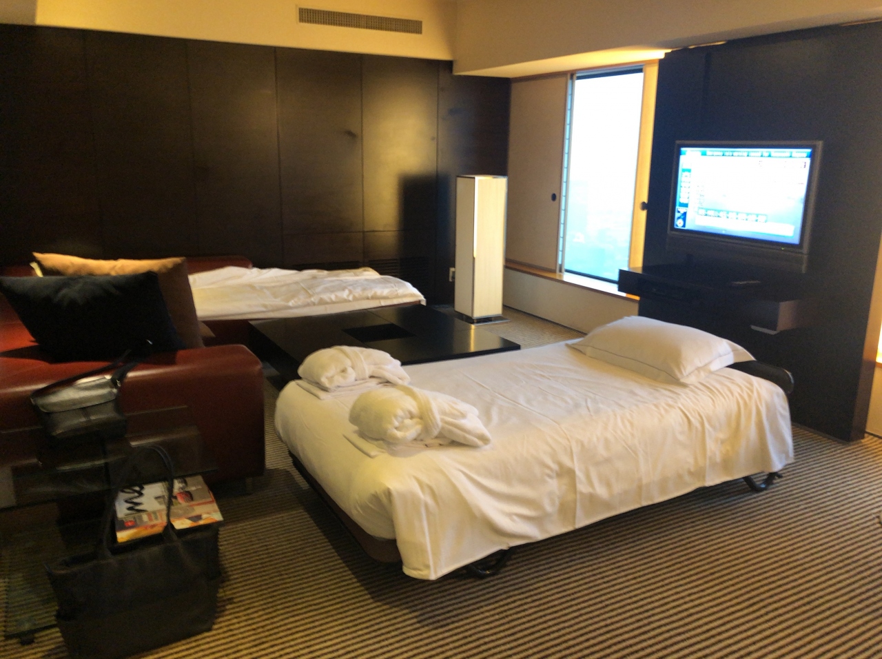 カテゴリーとしてはジャパニーズスイートになるようですが、普通にお布団が敷かれており、窓から見える景色が都会というだけで、閉めてしまえば旅館の居心地と一緒でした。