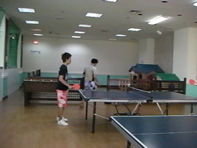 涼しい室内で卓球を家族がしているうちに、私は家族の洗濯をコインランドリーでします。