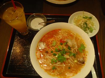 私は冷たいトムヤンクンヌードルを、友人はガパオをいただきました。