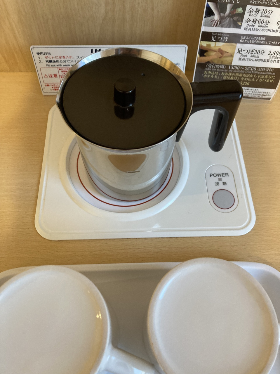 場所柄、海外の宿泊者がおおかったので、電気ケトルの利用が不安な方にもIHのようなもので飲み物のお湯を沸かせることができるものがありました。- 旅行時期