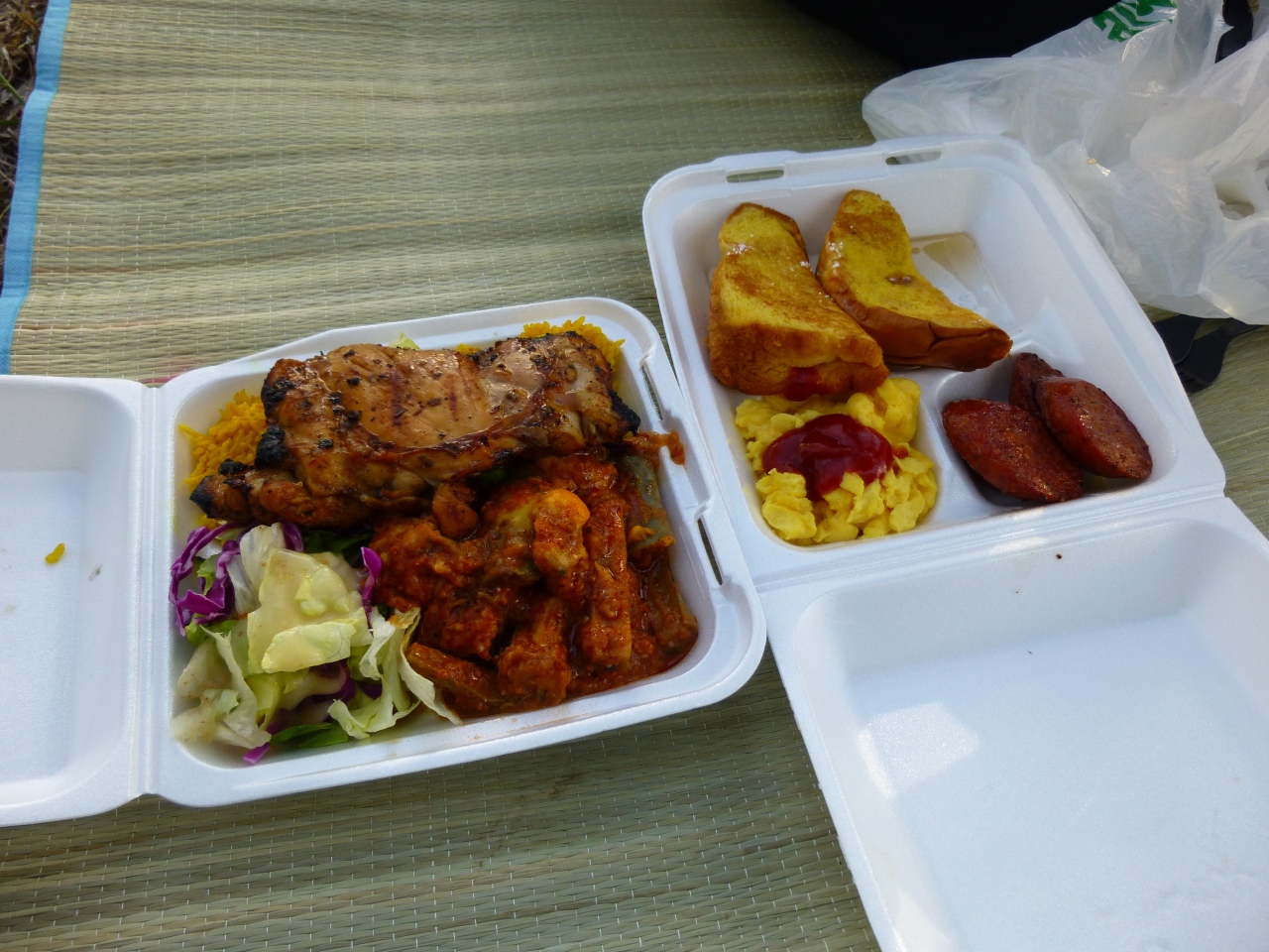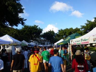 まだ昼前でしたが、すごい人。とても混雑していて、並ばないと買えないお店が多かったです。パイナップルジュースは濃厚で美味しかったです。地面に敷くためのござを無料で貸してくれるので、食べ物を買ったら