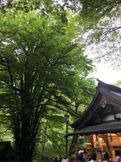 縁結びで有名な貴船神社。もともと「気生根」と表記されていたそうで、ご神木も瑞々しい大木でした。水に浮かべる水占いも有名ですが、その涌き出でるご神水は無料でいただけます。境内には、七夕まつりの短冊が飾られていて、賑やかでした。