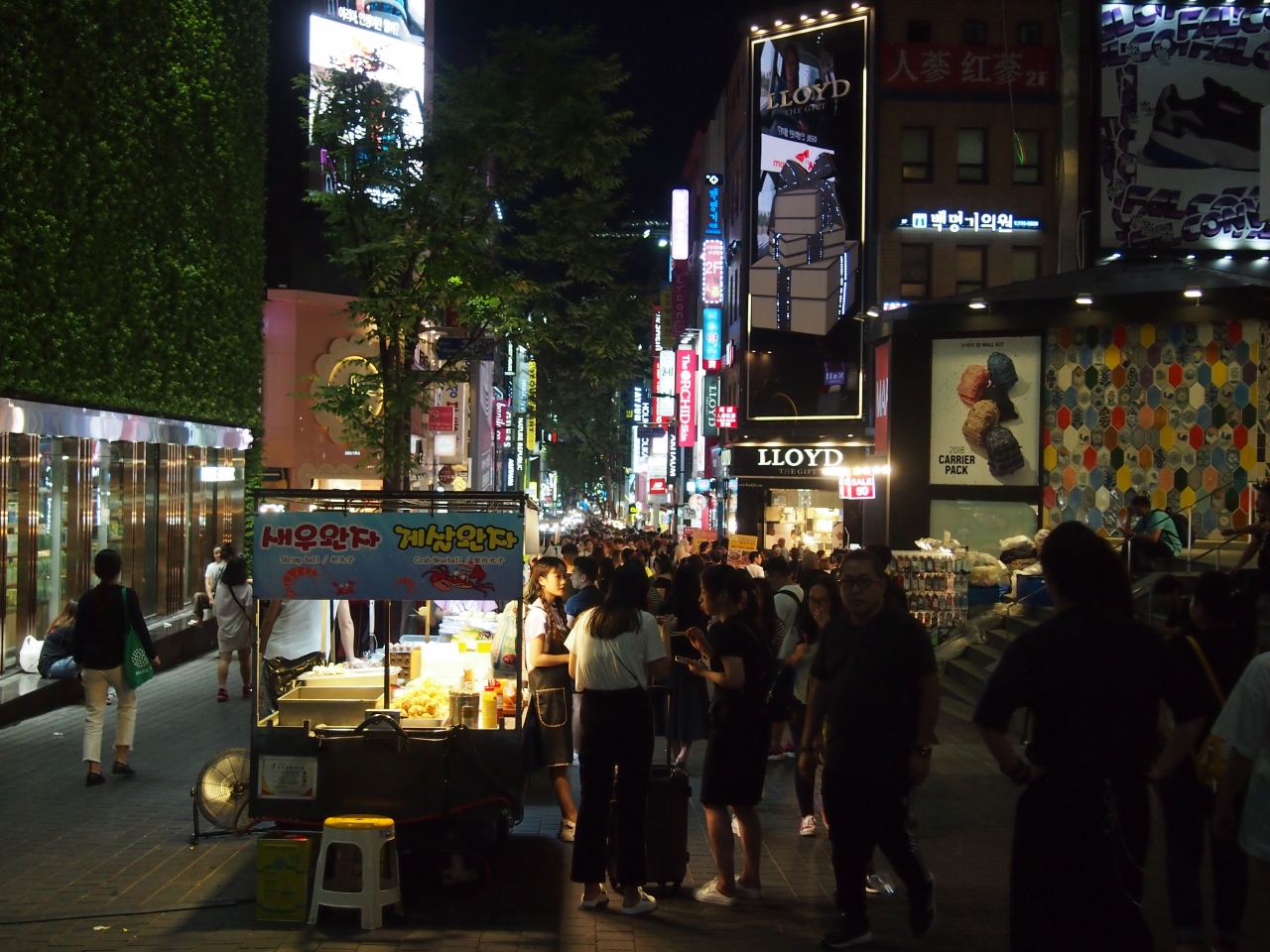 今回は、夜の明洞に行きました。色々な、食べ物の屋台に、雑貨などの屋台が出ていて、お祭りみたいで楽しかったです。帽子やバックの屋台ではシュプリームやSTUSSYやポーターなど、本物には見えないものが堂々売ってました