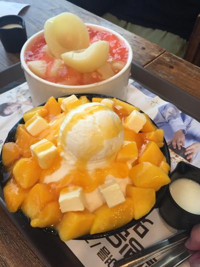 八月の平日15時頃に伺いましたが、注文のカウンターは二人待ち位で二階席はほぼ満席状態だったので、3階で食しました。食べてみたかった限定フレーバーのスイカは売り切れで、マンゴーと桃を注文しましたが、モモは残念ながら、シロップ漬けの缶詰めのようなものでした。日本のカキ氷とは全く違う面白い触感でした