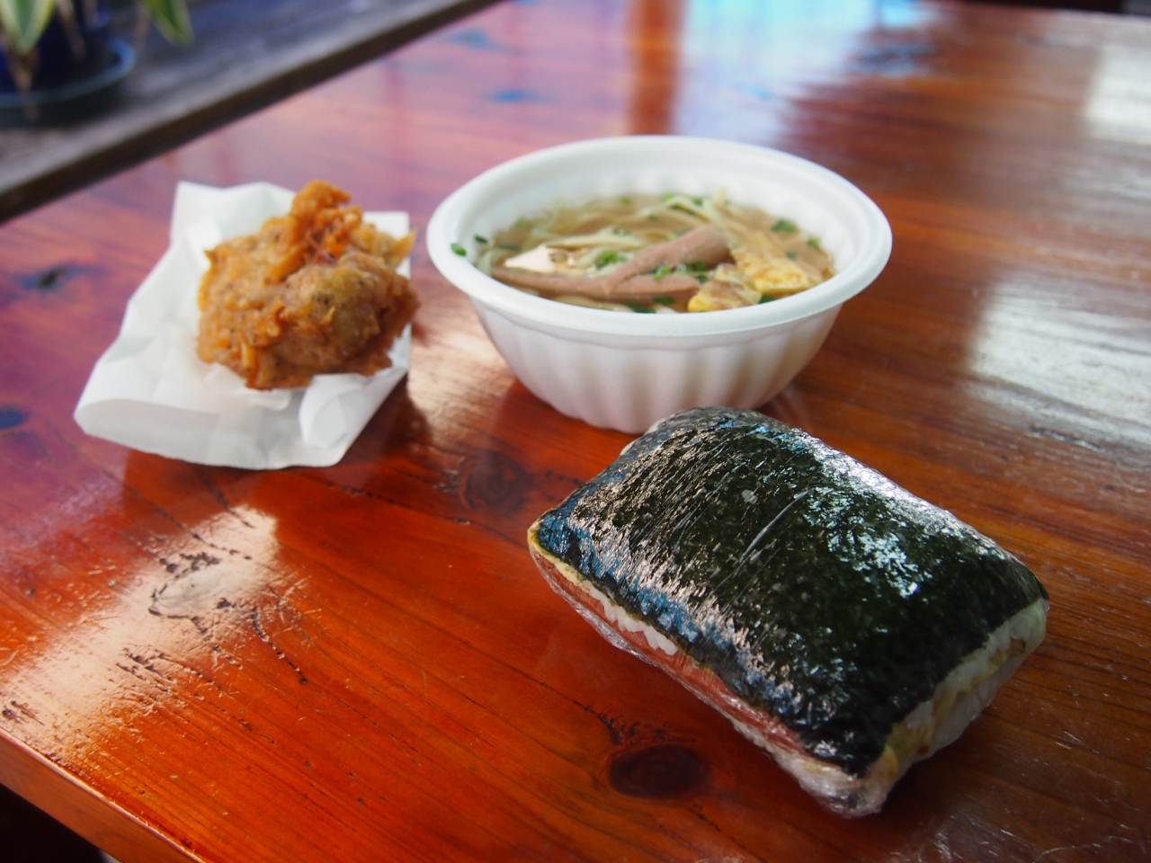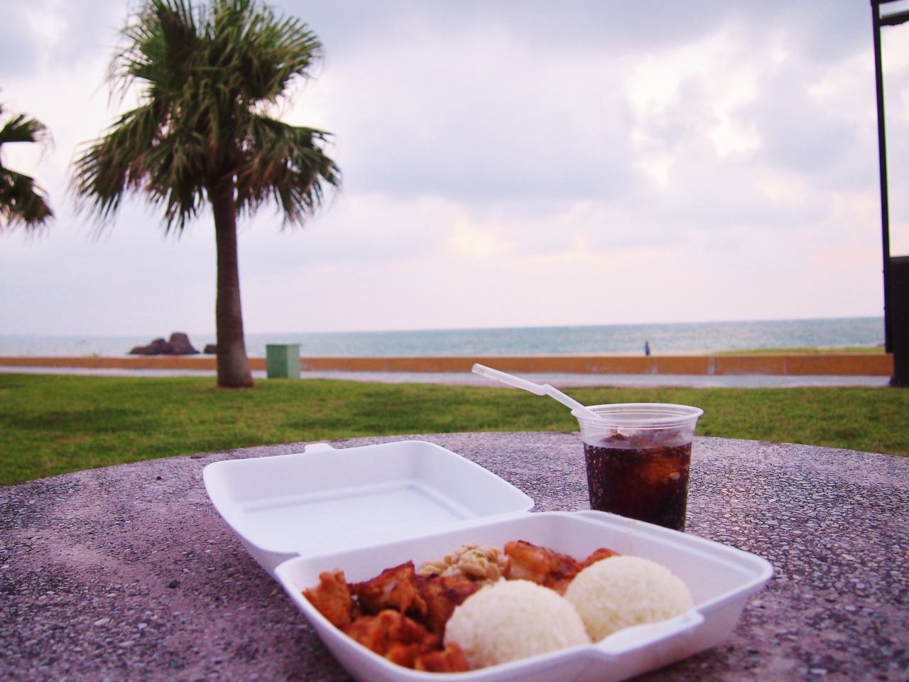昔、芸能界にいた沖縄大好きな芸人さんが、自分の番組内で大絶賛してたので、ずっと気になってたお店です。テイクアウトにしてもらい、お店の前のアラハビーチのベンチで食べました。弁当箱の容器といい、ご飯をアイスのディッパーでよそってるところといい、そして、外人さんが沢山ジョギングしてるアラハビーチといい、とてもハワイアンな雰囲気を感じながら食せました。
