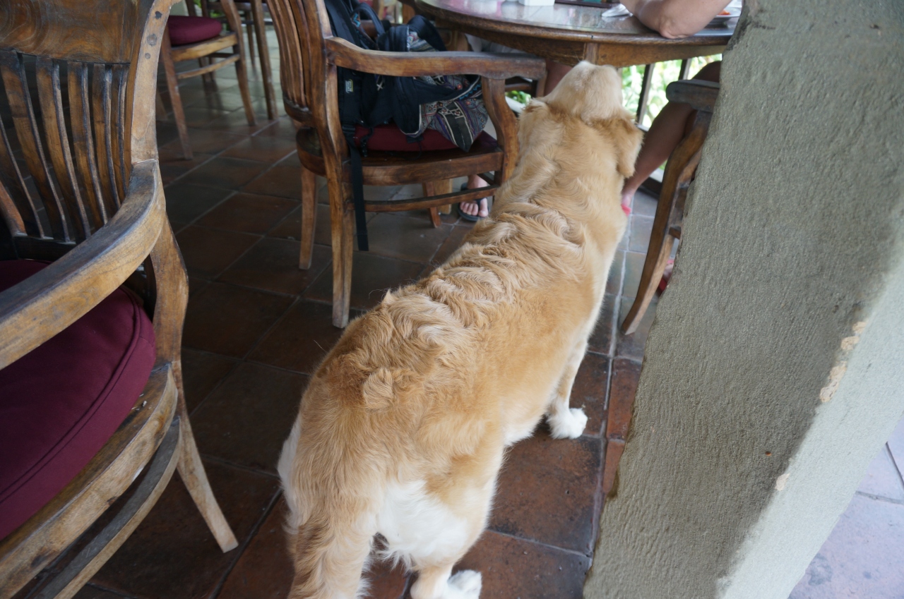 又大型犬を2匹、子犬を2匹放し飼いしており、レストラン内を歩き回り、すり寄ってきて、身体をブルブル震わしたり尻尾を振ったり、食べてる傍でハーハー息を吹きかけてきたり・・・犬の毛が飛びまわるのと臭いのとで参りました。