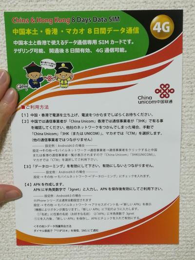 china unicomのsimは以前に香港旅行の際に使用し問題なく使えたので、今回もこちらの会社の商品を選びました。