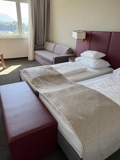 駅から見えるくらいアクセスは良好です。観光するにしても、旧市街までなんとか歩けました。(急いでいたので行きはbolt乗車、8.8€でモーツァルトの生家まで)窓から山々、ボーエンザルツブルグ城が見えました。天気が良かったのもあり、とても綺麗でした。部屋は思ったより広くて、トイレ、洗面台、湯船の部屋のスペースも広かったです。一つ気になったのは、平面部テレビの前や窓際にスナックのカスみたいなのが落ちていた事です