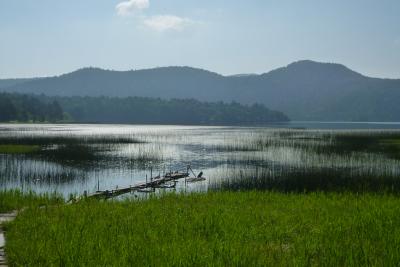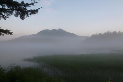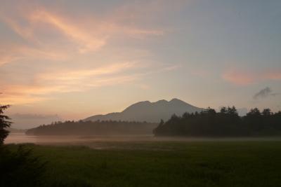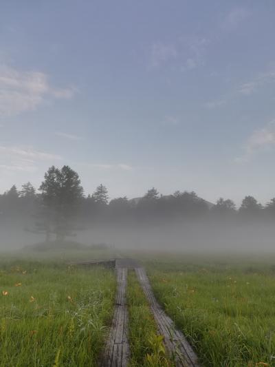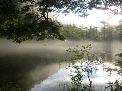 朝焼けの明神岳、朝もやの明神池。どちらも日中に見ていた上高地とは違って霞が梓川から立ち上り、山の裾には雲がかかり明神岳山頂は朝焼け、明神池も靄に覆われていました。思ったよりは人がいて皆思いっきり深呼吸をしている感じでした。