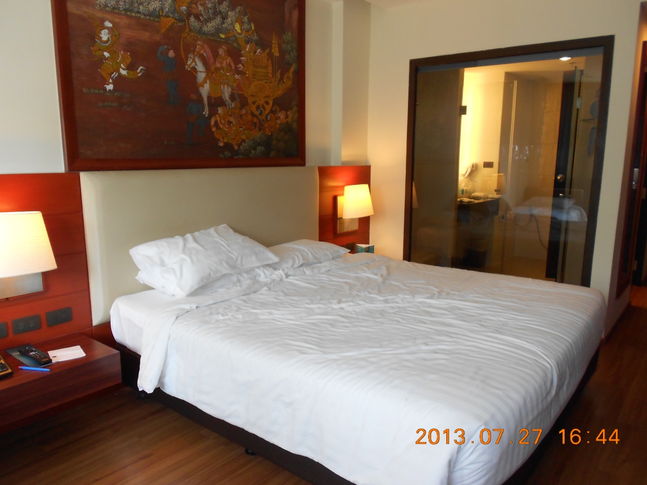 部屋は広い。ベットは大きいので子供連れにはうれしい。でも、ベットが臭い、小さい虫がいっぱいいる。シャワーのホースが短くて洗いにくい、トイレが流れない。しかし、2日でこれらに慣れます。一室7500円ほどでしたが、プーケットあたりならこの値段なら、もうちょっといいホテルに泊まれる。