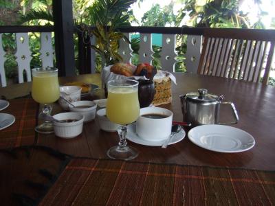 テラスでとる朝食はおいしくてボリュームたっぷり。