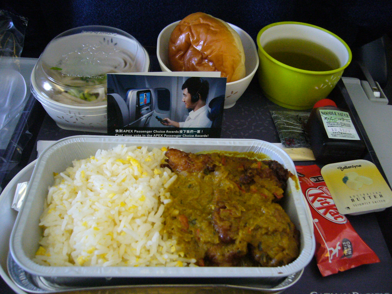 初めての利用です。乗り心地、接客対応共に普通によかったと思います。香港までは約3時間弱の飛行、アッという間に到着。機内食はシーフードカレーをチョイス。特別美味しいというわけではありませんが、完食です。比較的安価で利用できる航空会社としては、また利用したいと思います。