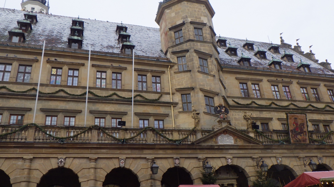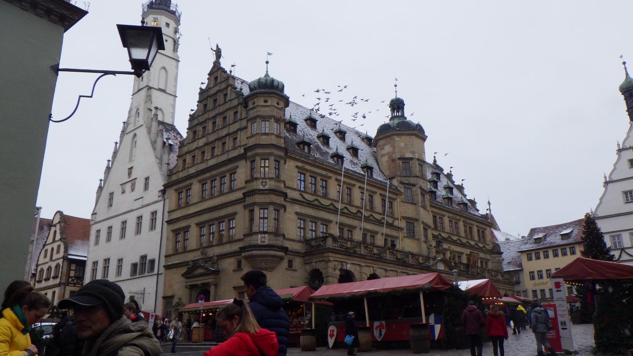 門をくぐって旧市街地に入って真っすぐに進むとマルクト広場に出ます。その前に市庁舎があります。市庁舎隣に立つ市議宴会館はからくり時計があり市長がワインを飲み干す仕組みになっています。市庁舎の塔に上ることができローテンブルクの町を眺めることもできます。