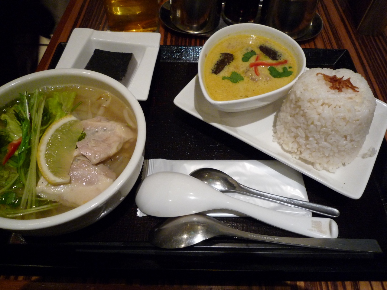 お昼に、レディースセットで、鳥のフォーと、カレーを食べました。どちらも日本人用の味付けになっていて、食べやすかったです。お値段もフォーと、カレー、黒ゴマプリンで980円でお安く、牛肉のフォーセットは1100円でした。お店の中はとても狭いので、大人数の来店には向かないですね。カップルとか、多くて4人くらいまで。人気があるみたいで、15時近くに入店したのに、満席でした。また、行くことがあったら是非食べたいです。