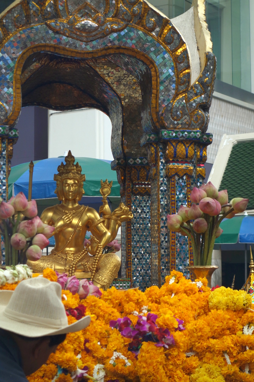 バンコク1のご利益があるというエラワン・プームです。必ず中でお花とお線香とろうそくを買ってください。外で買うと高いです。1セット50バーツです。4面ありますので、それぞれにお祈りしてください。タイ人の方々の熱心なお祈りを見ているとそれだけでもご利益ありそうです。お祈りしたことがかなうと、お礼として踊りを寄進するそうです。