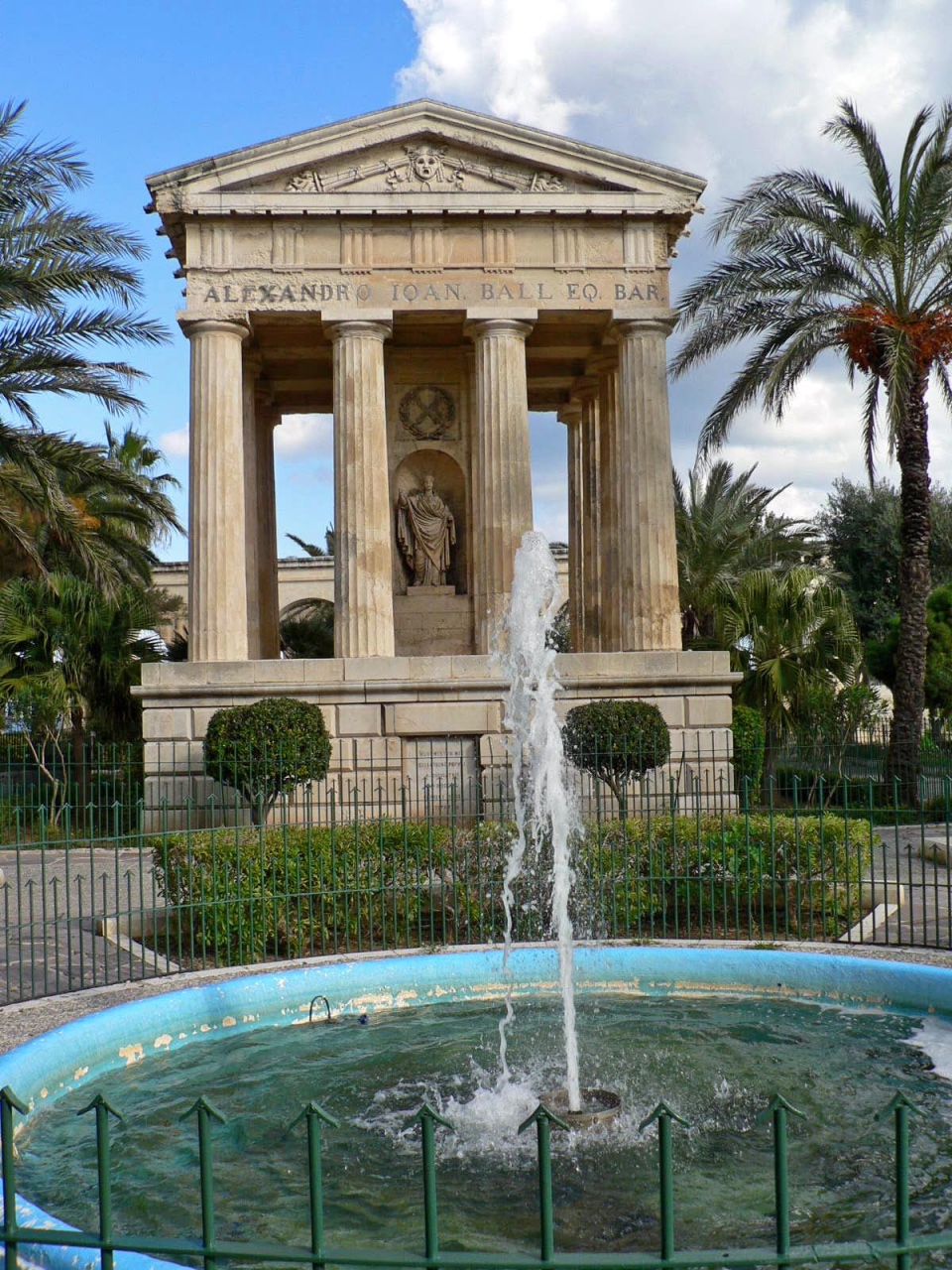 1799年にナポレオン率いるフランス軍を撤退させた初代の英国マルタ総督、アレクサンダー・ボール卿に贈られた新古典様式の神殿が目を引く。