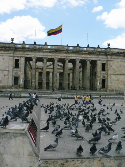 ボゴタの国会議事堂はボリーバル広場のシモン・ボリーバル像の南側にある。コロンビア国会議事堂はイオニア、ネオクラシカ、ルネッサンス様式の影響を受け1847年にトーマス・リードの設計で建設が開始されたが、政治的問題の発生で中断され、完成は1925年。正面の3列6本のイオニア様式の柱はギリシャの神殿風だ。