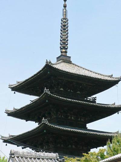 八坂の塔(法観寺)は、飛鳥時代に、このあたりに勢力を持っていた八坂氏の氏寺として創建された。寺伝によると聖徳太子の創建ともいう。五重塔は、通称八坂の塔と呼ばれ、創建以来戦乱などによりしばしば失われて来ており、現在のものは1440年(永亨12)足利義教により再建されたものである。高さは46メートルあり、応仁の乱の際には物見櫓として使われたらしい。現在は重要文化財に指定されている。他に薬師堂、太子堂が残る。臨済宗建仁寺派。
