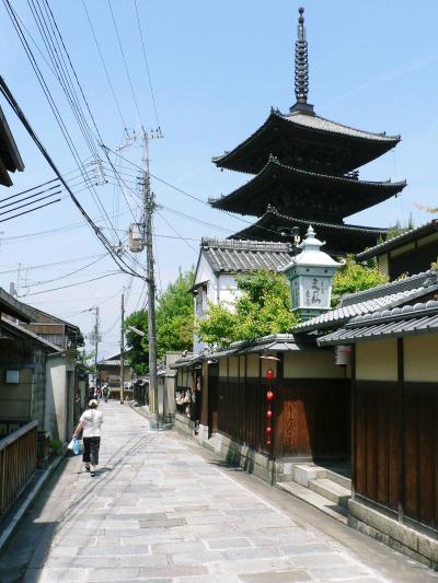八坂の塔に続く八坂道は、鴨川のすぐ東の縄手通から三年坂へ続く道。明治以前は辰巳新地という花街だった所で、遊女が八坂の塔を巡って踊る八坂踊が、風物詩になっていたそうだ。今は比較的静かな道で八坂の塔がきれいに見える。市バス清水坂から徒歩5分弱。