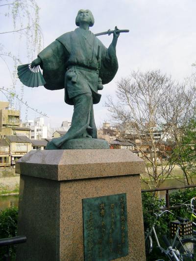 1603年、鴨川の河原で歌舞伎の始祖出雲阿国が初めて「かぶきをどり」を披露した。1953年、11月の顔見世興行の前に歌舞伎発祥350年を記念して南座前に建設された。四条通り南座前、京阪四条駅下車すぐ、鴨川河畔にある。(写真は出雲阿国像)- 旅行時期