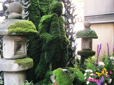 法善寺は石畳が続く古い路地の中にある。織田作之助の小説「夫婦善哉」の舞台としても有名。法善寺には商売繁盛や恋愛成就を祈願する人達がかけた水で、全身が苔むした水掛け不動がありお参りする人は絶えることが無い。1960年に藤島桓夫(ふじしまたけお1927−1966年)の歌で大ヒットした「月の法善寺横町」で水掛け不動を知った人達がたくさんお参りされているそうだ。地下鉄なんば駅から徒歩10分。