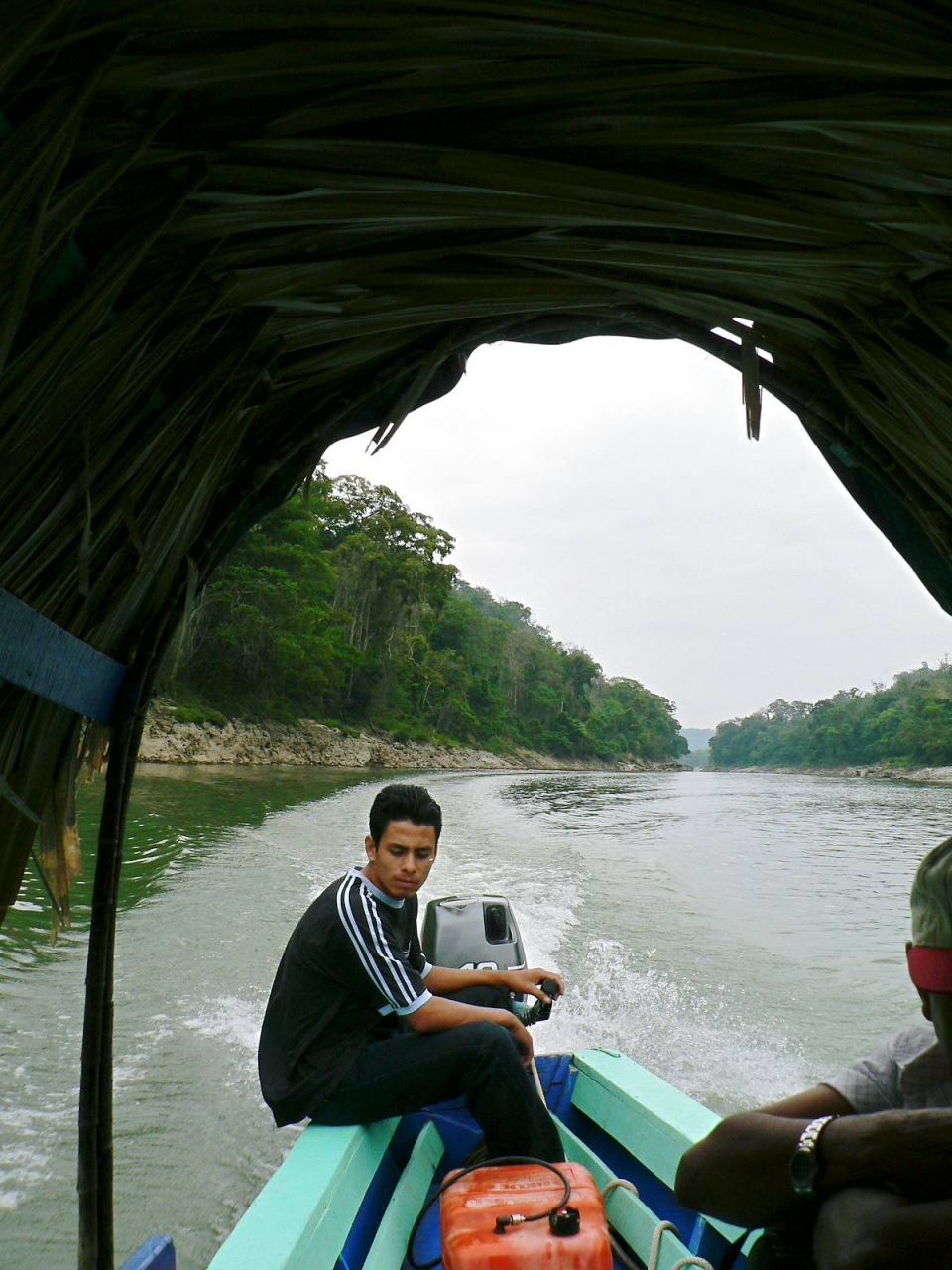 グアテマラ・フローレスからメキシコ・パレンケに移動するバスチケットはフローレスの旅行会社で購入した。料金は30米ドル・3600円だった。早朝5時にフローレスをミニバスで出発し、グアテマラのエル・ナランホまで行き、イミグレーションで運転手の指示で日常化している賄賂40ペソ・680円払わされ、ボートに乗り換えてメキシコ国境のテシノケまで川くだり40分。メキシコ側のテシノケでの入国審査は簡単で金の要求も無かった。テシノケからパレンケまではミニバス。グアテマラ・フローレスからメキシコ・パレンケまでのトータル時間は10時間だった。バスとボートの移動は変化があって楽しい。