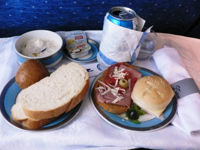 3.ビジネスクラスの機内食;サンドイッチ、マカロニ・グラタン、ケーキ、ビール、シャンペン。ビジネスクラスの割りには今ひとつだった。