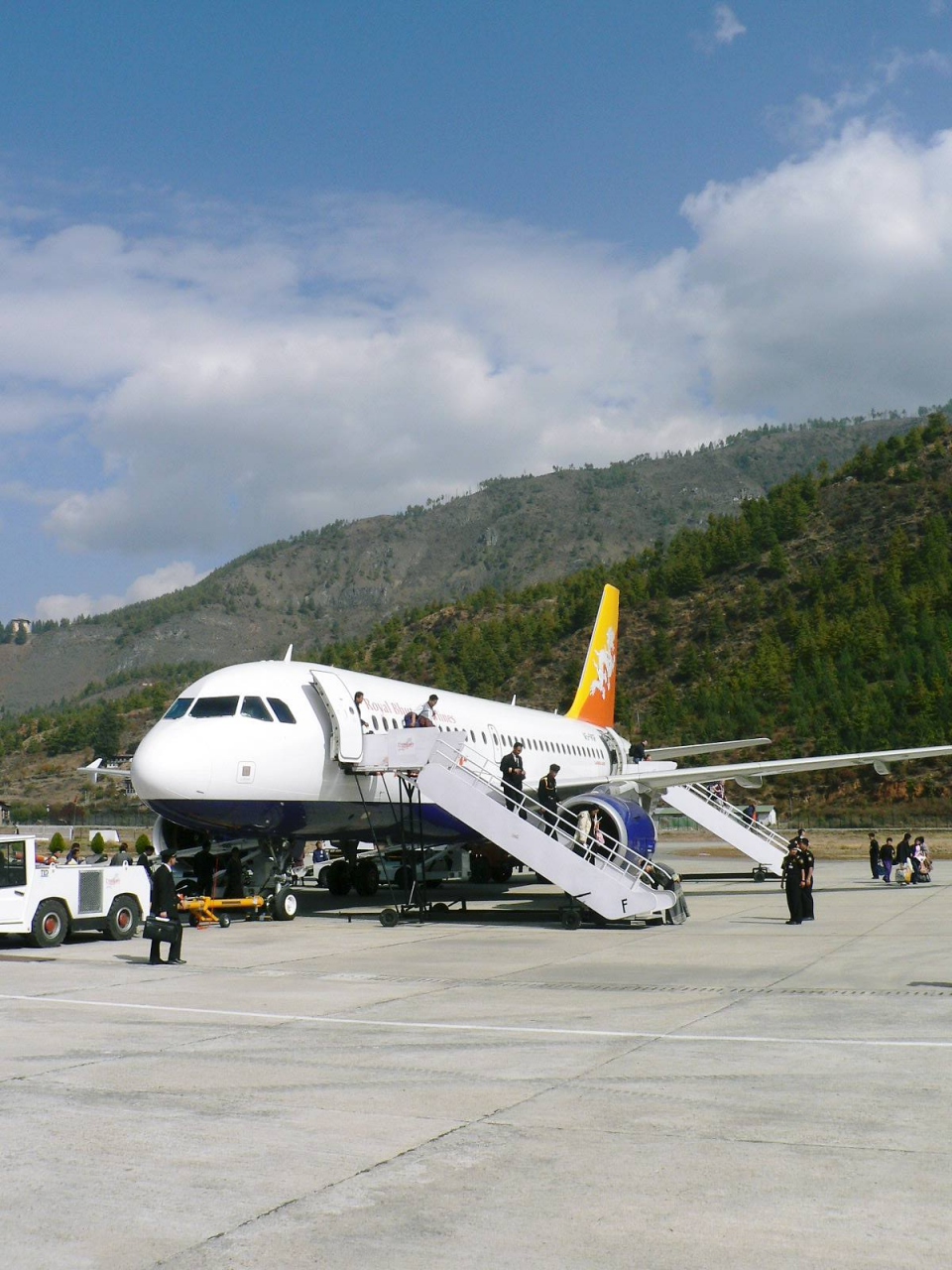 ネパールからブータンに入国したが、空路ではドゥク・エア(ブータン航空)でしか入国できない。ドゥク・エアは2004年10月から114席のA319の運用をしているが70席程度の旧機を含めて3機しか持っていない。しかも国王が使用のときは国王のスケジュールが優先され1機使用するため欠便が出る。チケットが取りにくく、予約後もキャンセルされることがある。私の場合も2度変更された。入国の1-2ヶ月前には予約しておくことが望ましい。