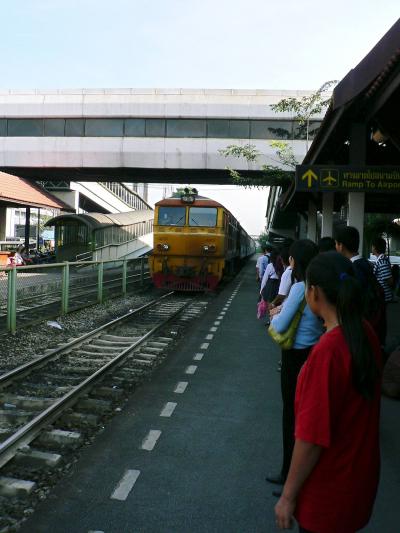 国際線到着ロビーから役100m歩いた所にあるドン・ムアン鉄道駅からバンコク中心部のフアラポーン駅まで約1時間、3等車で5バーツ・15円。英語でも切符を売ってくれた。列車は1時間に1,2本だが、時間があれば鉄道の旅は安くて便利だ。フアラポーン駅から地下鉄(26B−80円)近距離タクシー(40B−120円)だったのでかなり安い移動ができる。