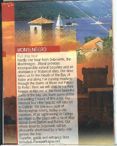 クロアチアのドブロヴニクから約50Kmのモンテネグロのコトル世界遺産への旅が可能です。Adratic Luxury Services +385-20-437-287 が主催するツアーで、費用は約300KUNA(約6000円)です。成立しない場合もありますが、1週間前に予約が必要。レンタカーの場合、保険込みで1日約50ユーロ(7000円)から。但しガソリン(約1ユーロ/リッター)は別。タクシーで往復する場合は約1000KUNA(約2万円)です。(写真はモンテビデオツアーのパンフレット)