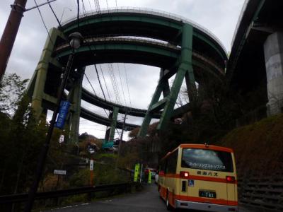 河津七滝ループ橋(かわづななだるループきょう)は静岡県賀茂郡河津町の国道414号にかかる橋で全長1064m、高さ45m、直径80mの二重ループ橋で下田市側からは反時計回りの上り坂、伊豆市側からは時計回りの下り坂。1978年の伊豆大島近海の地震で山腹の道路が寸断した後通行の利便性と高低差を解消し土砂崩れのない工法を採用し1981年にループ橋が完成している。河津七滝ループ橋は2度目だが便利なだけでなく、景観も素晴らしい。