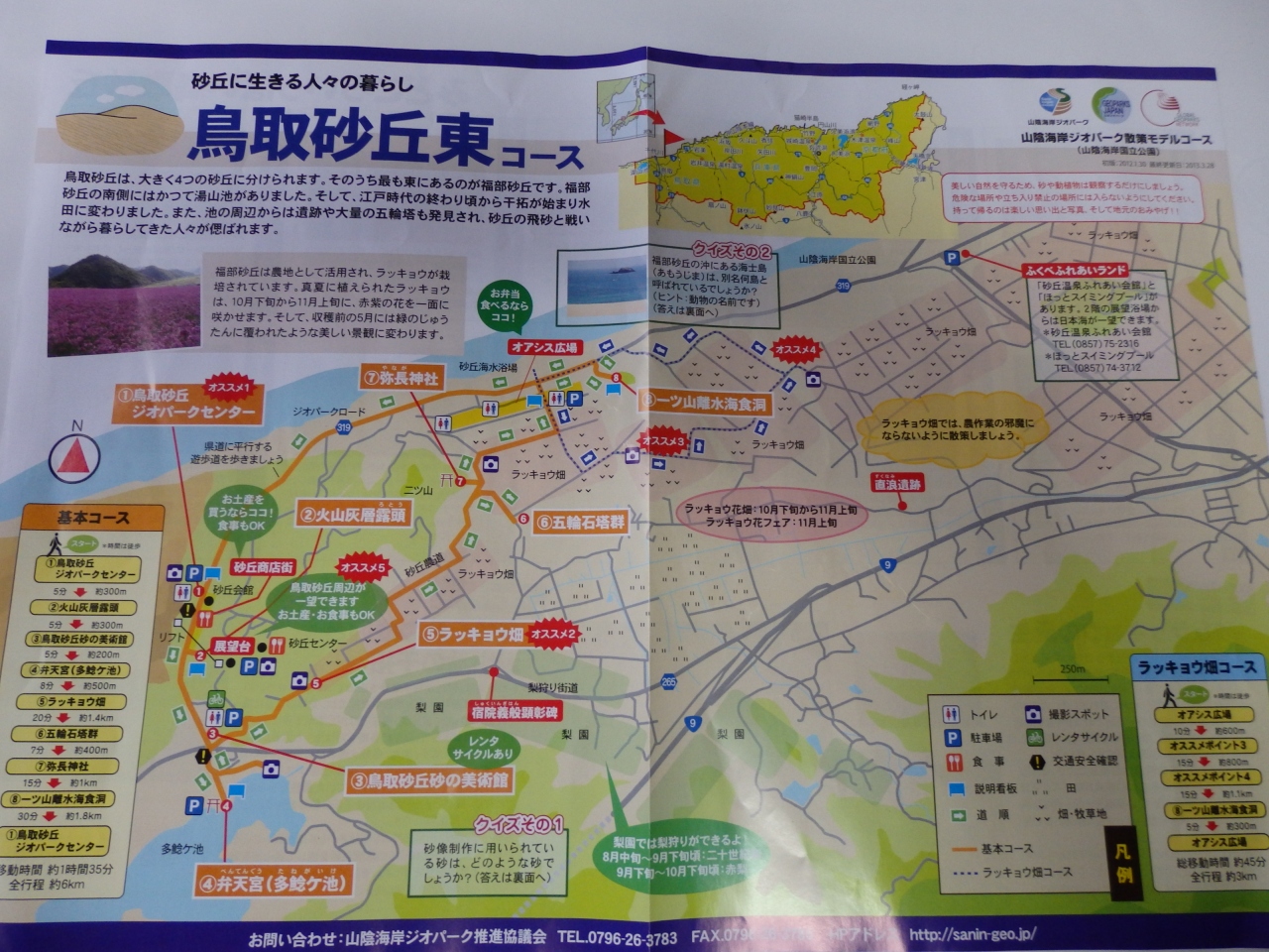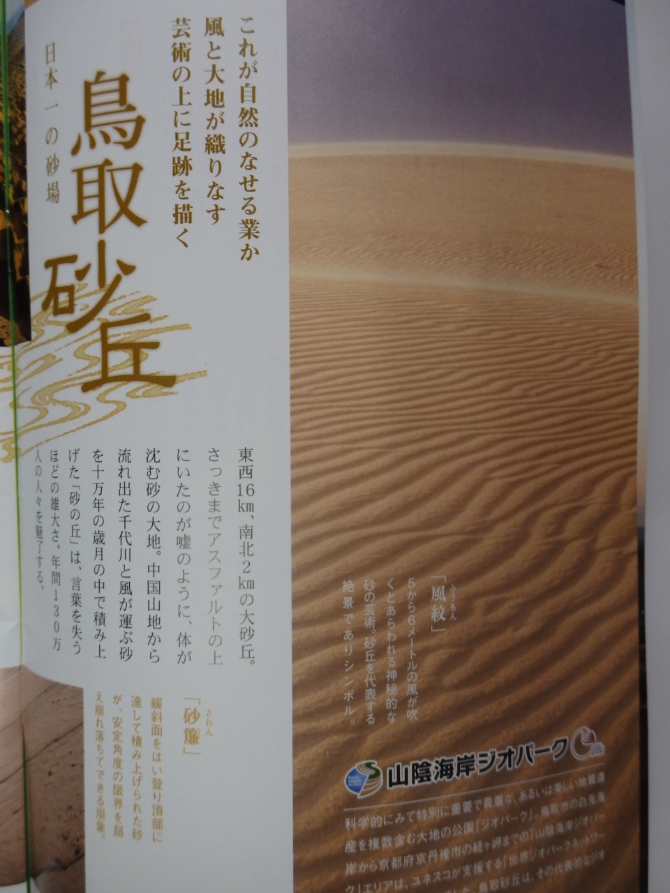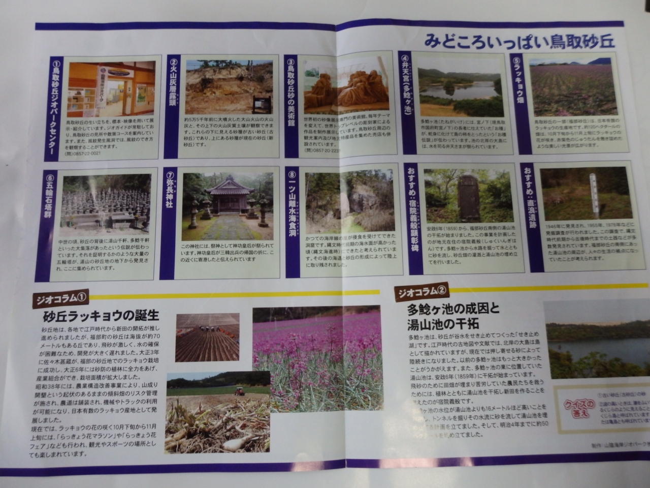 「鳥取砂丘ジオパークセンター」は、2010年の春に鳥取砂丘に近い市営駐車場内に開館されている。砂丘の生い立ちを標本や映像を用いて展示・紹介している。山陰海岸ジオパークとは山陰海岸国立公園を中心として東は京丹後市の経ヶ岬から西は鳥取市の白兎海岸までの東西約110km、南北最大30kmのエリア。この地域は約2600万年前に日本列島がアジア大陸の一部であった時代の岩石から今日に至るまでの経過が確認できる地形や地質が存在している。鳥取砂丘ジオパークセンターでは砂丘周辺で暮らした人々の歴史・文化を学ぶことができる。9:00~17:00、無休、無料、鳥取市福部町湯山2164-661