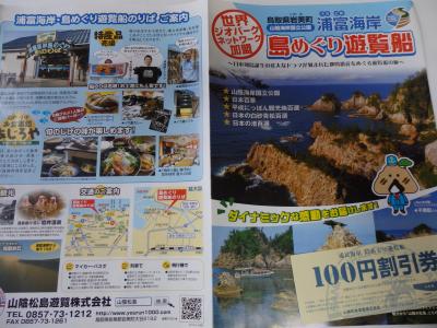 浦富海岸(うらどめかいがん)は鳥取県岩美郡岩美町にある約15キロメートルにわたるリアス式海岸で国の名勝、天然記念物に指定され「日本百景」、「日本の白砂青松百選」、「日本の渚百選」、「平成にっぽん観光地百選」などに選ばれている日本海沿岸の自然景勝地。海岸西部には海水等の侵食による花崗岩の断崖、奇岩、洞門が続き、海面上に大小の島や岩が散在する風景が宮城県の松島に似ていることから「山陰の松島」と呼ばれることもある。浦富島めぐり遊覧船乗り場は鳥取県岩美郡岩美町大谷2182.にあり利用時間は9:10∼16:10.浦富島めぐり遊覧船は. 11月までで11/28以降の出発は「山陰海岸ジオパーク巡り」となる。一般料金は\1,200 。
