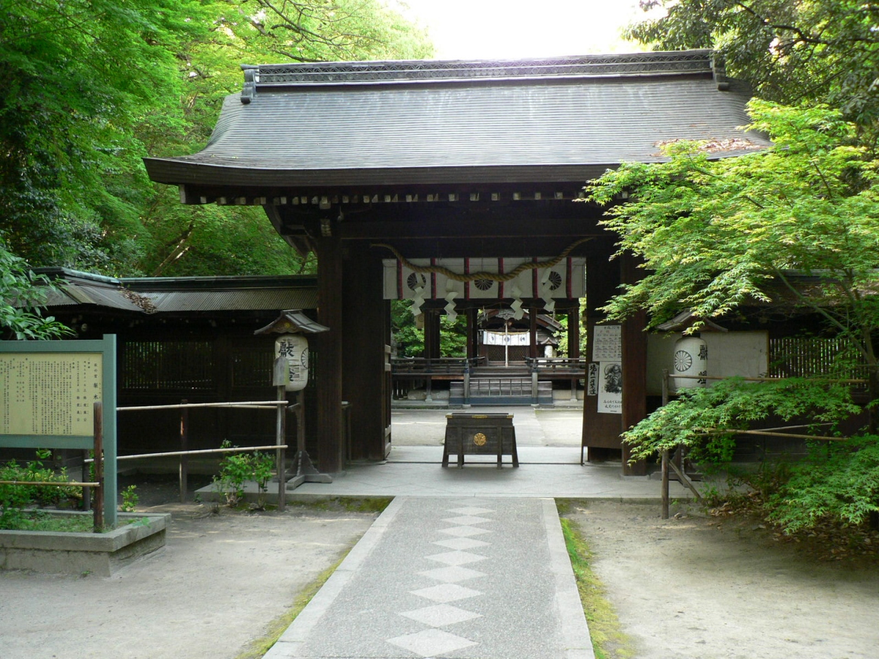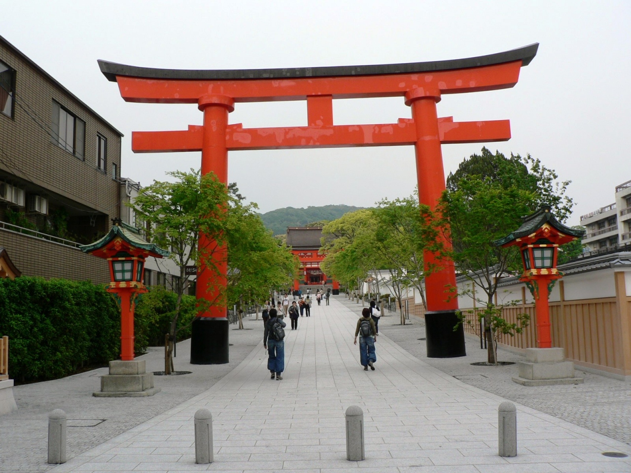 伏見稲荷大社(ふしみいなりたいしゃ)も京都市伏見区の神社で稲荷山の麓に本殿があり、稲荷山全体を神域とする全国約4万社の稲荷神社の総本社。朱い鳥居と、神使の白い狐がシンボルとなっている神社として、広く知られている。伏見稲荷大社の境内には、いたるところにキツネの像が据えられている。稲穂や巻物、鍵をくわえたり、顔の表情が違うのがおもしろい。