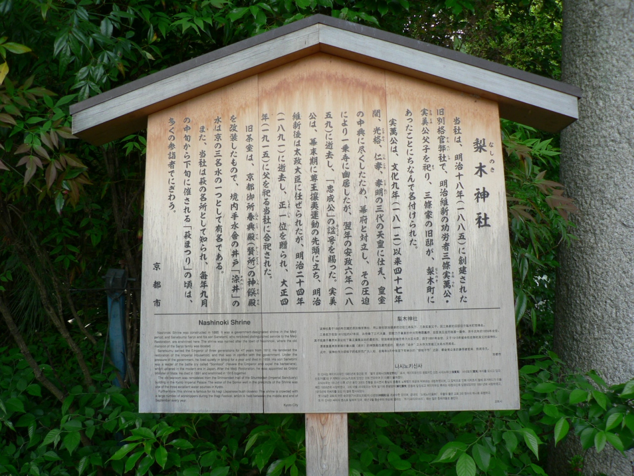 梨木神社(なしのきじんじゃ)は、明治維新に貢献した三條實萬(さんじょう さねつむ1802−1859年)・三條實美(さんじょう さねとみ1837−1891年)父子を祭神としており神宮丸太町駅から徒歩10分.で参拝できる。境内の井戸の水は「染井の水」と呼ばれ、京都三名水(醒ヶ井・県井・染井)のひとつとされ現存しているのは染井の水のみとのこと。