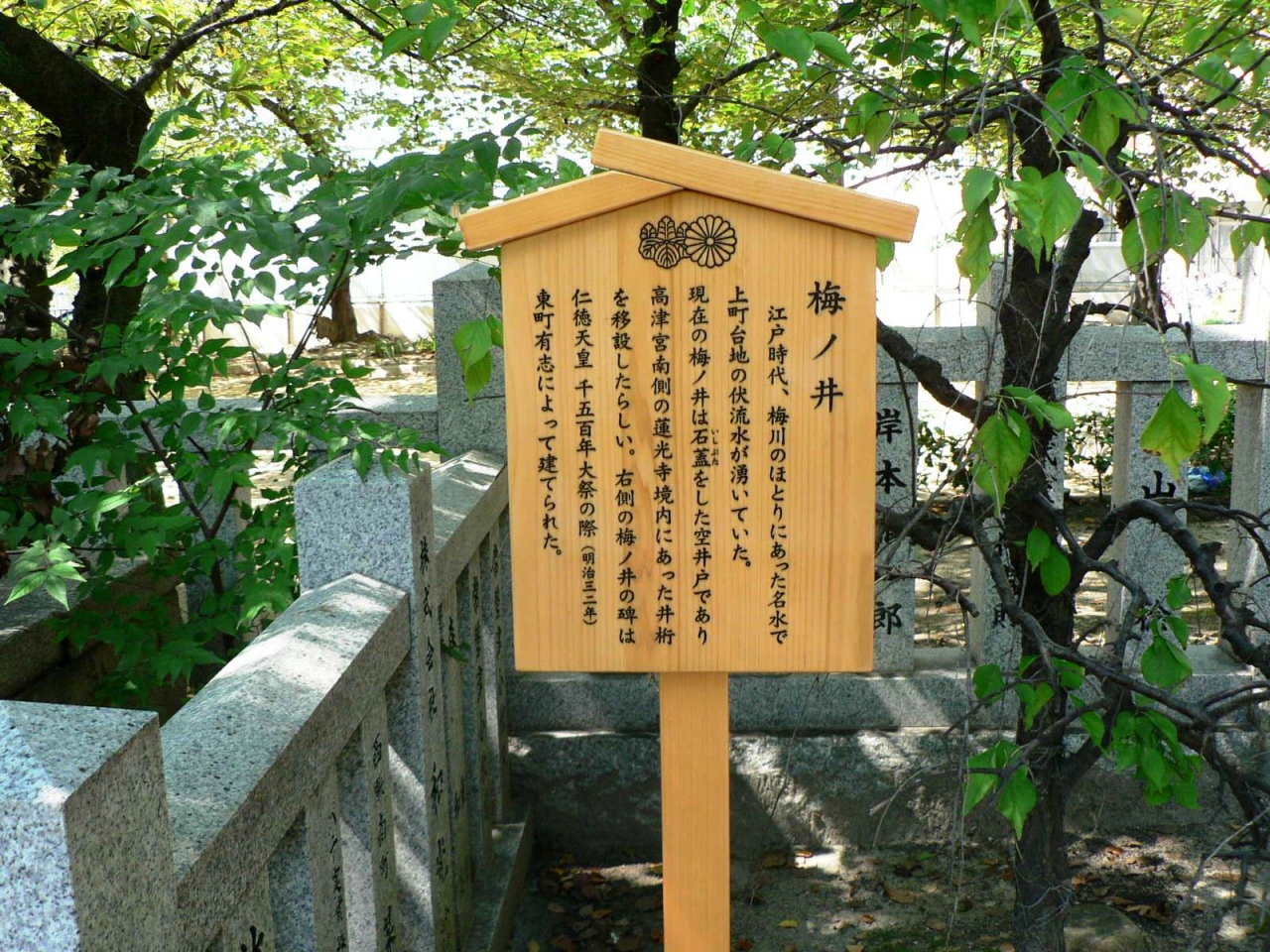高津神社参道にある梅ノ井の碑。道頓堀にそそぎこんでいた梅川のほとりにあった名水で上町台地の伏流水が湧いていたものでかつて梅の名所だったので『梅ノ井』と呼ばれたが今は空井戸とのことだが大阪の自然環境の変遷がわかる。