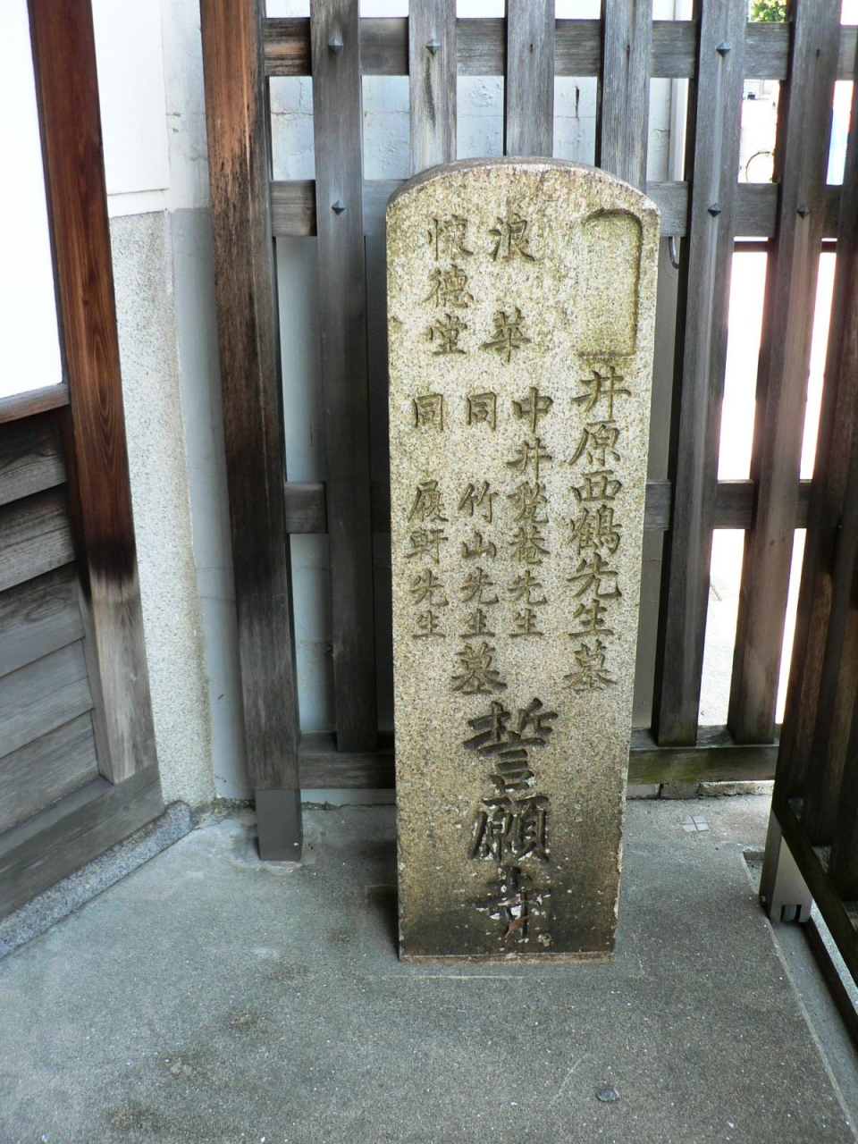 誓願寺(大阪市中央区上本町)の井原西鶴の墓には「仙皓西鶴」と刻まれている。この墓について藤原秀憲氏は、「発見した功労者は朝日新聞記者木崎好尚。明治二十年代に探しあぐねて同寺境内の片隅に座り、何げなく枯れ枝で地面に転がっていた石をこすってみると、それが西鶴の墓であった。うれしく泣きだした好尚は、さっそく幸田露伴に連絡、二人でお金を出し、墓地で一番いい場所に移建した」とのこと。傍らに「鯛(たい)は花は見ぬ人もあり今日の月」の西鶴句碑が立っている。