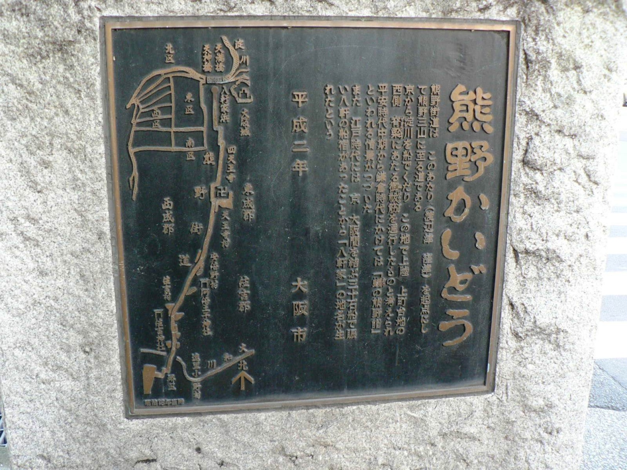 熊野街道の出発点の碑が八軒家船着場近くにある。上町台地の北端には、平安時代には渡辺津と呼ばれる港があり、紀州熊野本宮への参詣路である熊野街道の出発点として賑わった。江戸時代には八軒の船宿などが軒を並べていた事から八軒家浜と呼ばれ、京洛から淀川を下ってきた三十石船が到着した。熊野参詣の起点、京都と大坂を結ぶ淀川舟運の要衝として栄え十返舎一九「東海道中膝栗毛」では、舟を下りた弥次郎兵衛と北八が「大坂の八軒家」で上陸している場面が登場する。