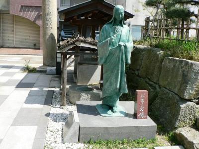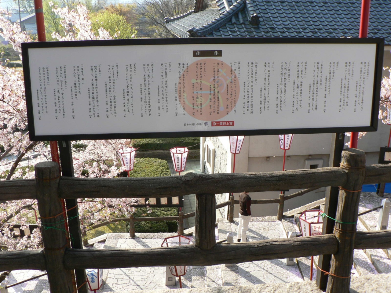 時宗の開祖・遊行上人(ゆぎょうしょうにん=一遍・いっぺん1239−1289年)が海辺から運んだ参道の砂の上に射す清らかな月光のなんと美しいことか、と芭蕉同様に日本国中を行脚した一遍に思いを馳せた名句の碑と芭蕉像が境内に建てられている。旅の俳人・芭蕉は旅の宗教家・一遍と心情的に通じるものがあったのだろう。