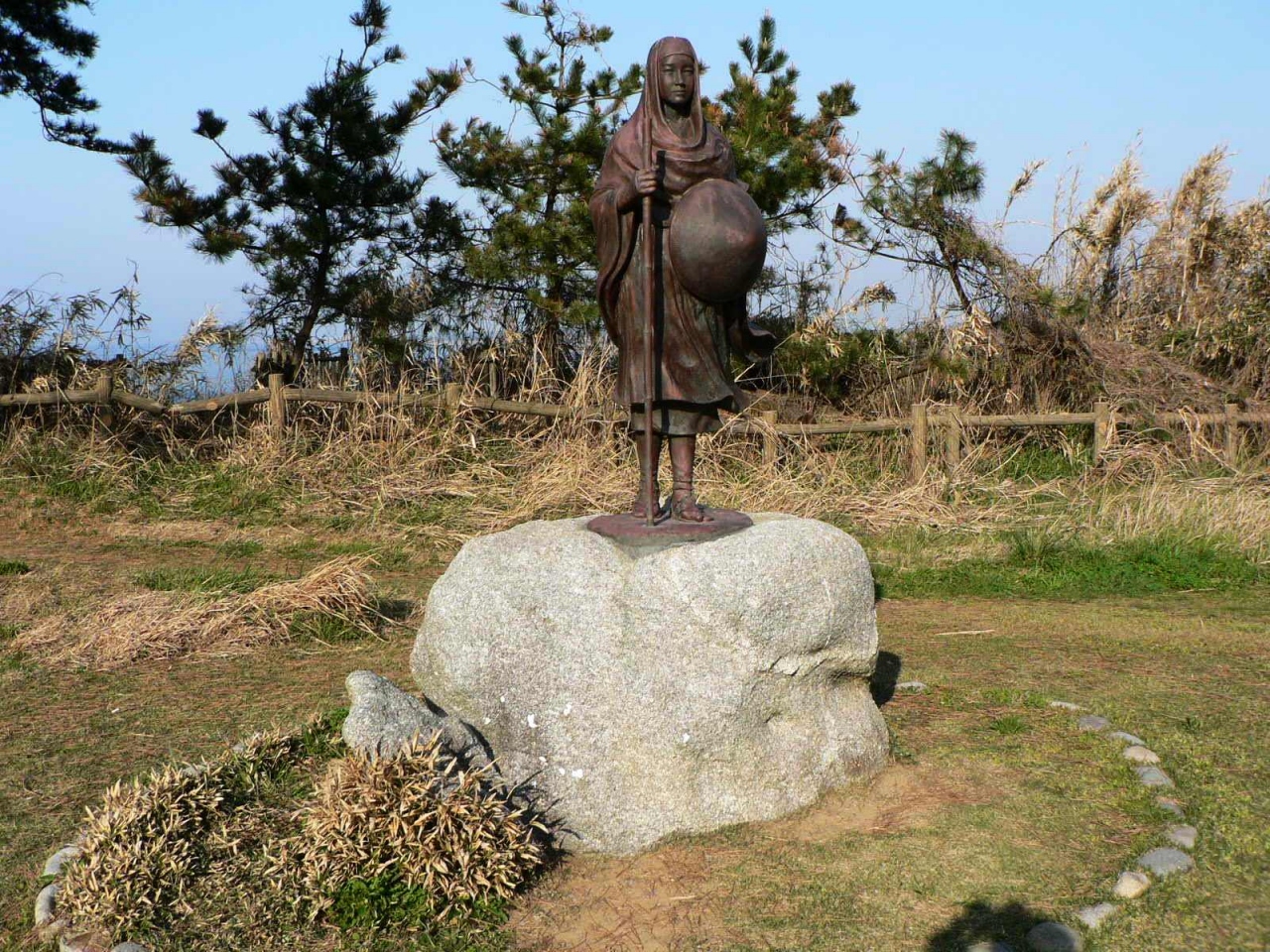 海食で岩肌が削られた高さ約25mの岩壁は輝石安山岩の柱状節理で天然記念物。輝石安山岩の柱状節理(五角形、六角形の柱状の岩の集まり)は韓国の金剛山、スカンジナビア半島のノルウェーの西海岸を含めて世界で3箇所しかない地質学的にも貴重な自然遺産とのことだ。
