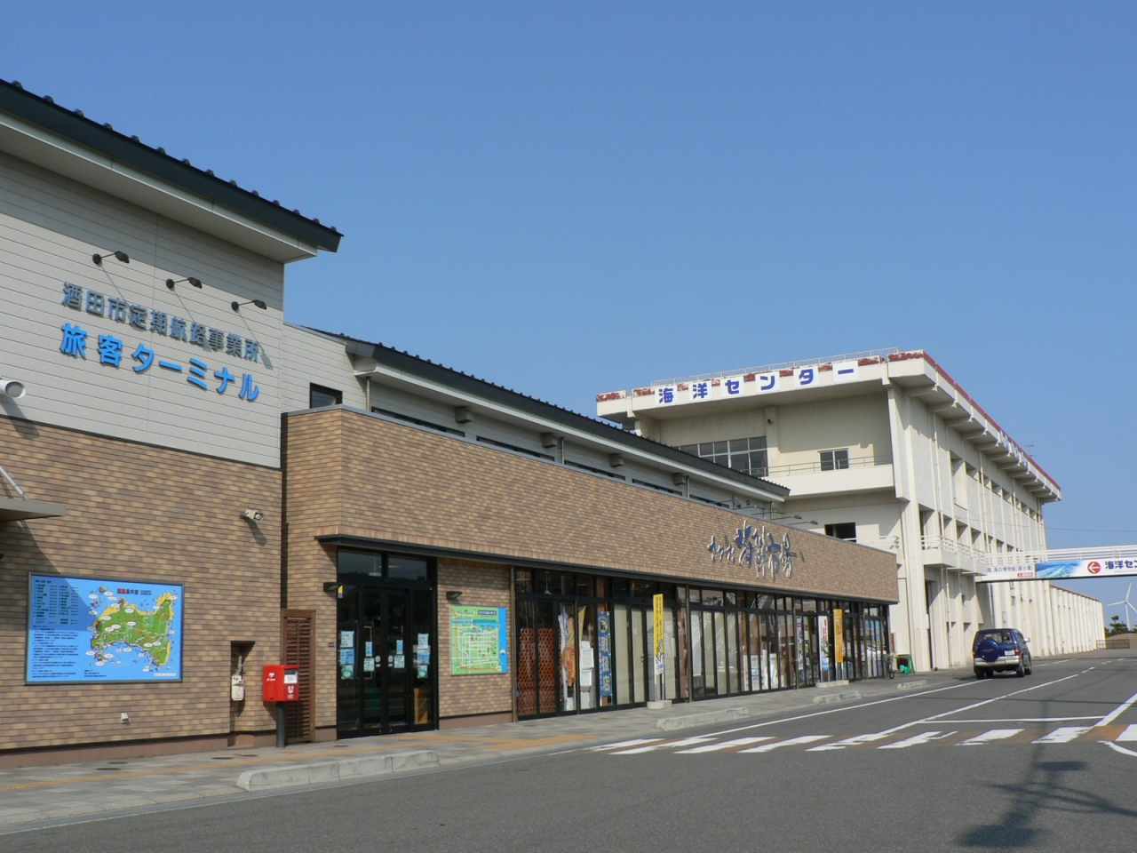 飛島行き定期船乗り場へのアクセスーー酒田駅より車10分、山形自動車道酒田ICより車15分