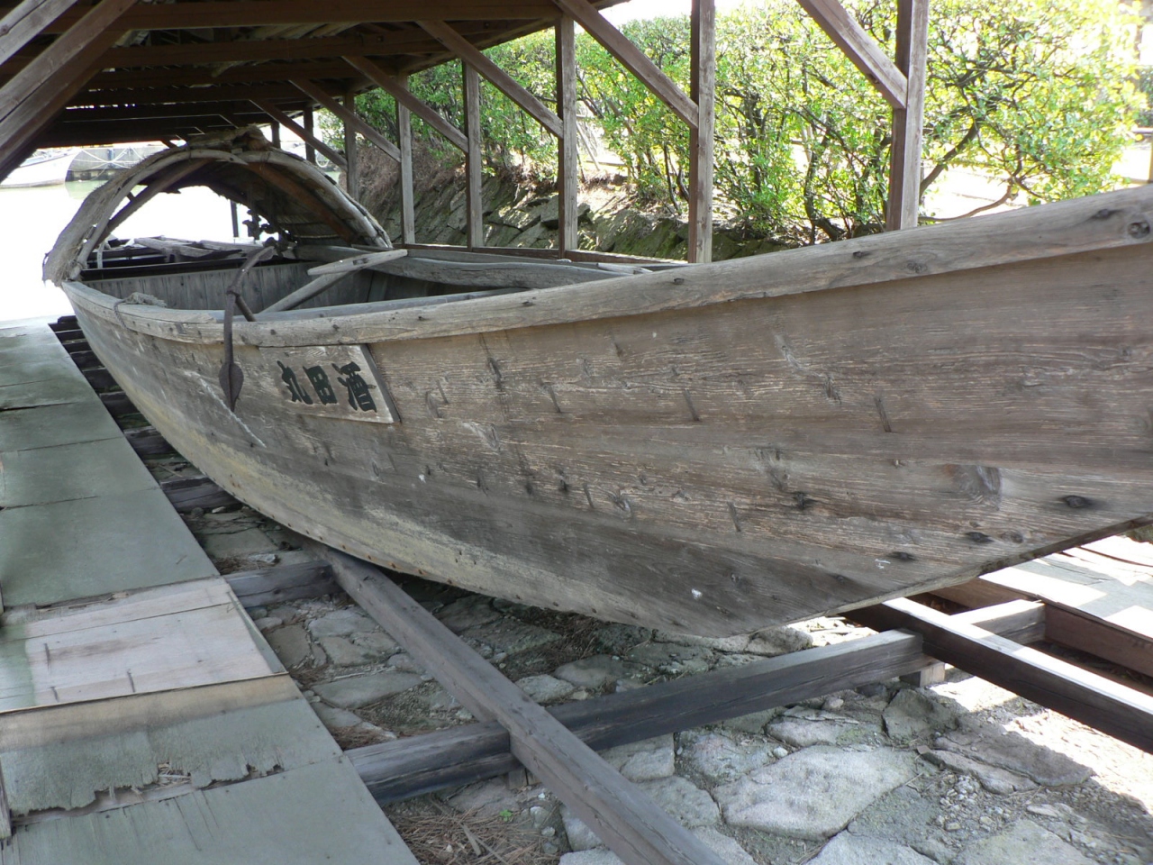山居倉庫の手前には、小鵜飼船(こうがいぶね)が展示されている。