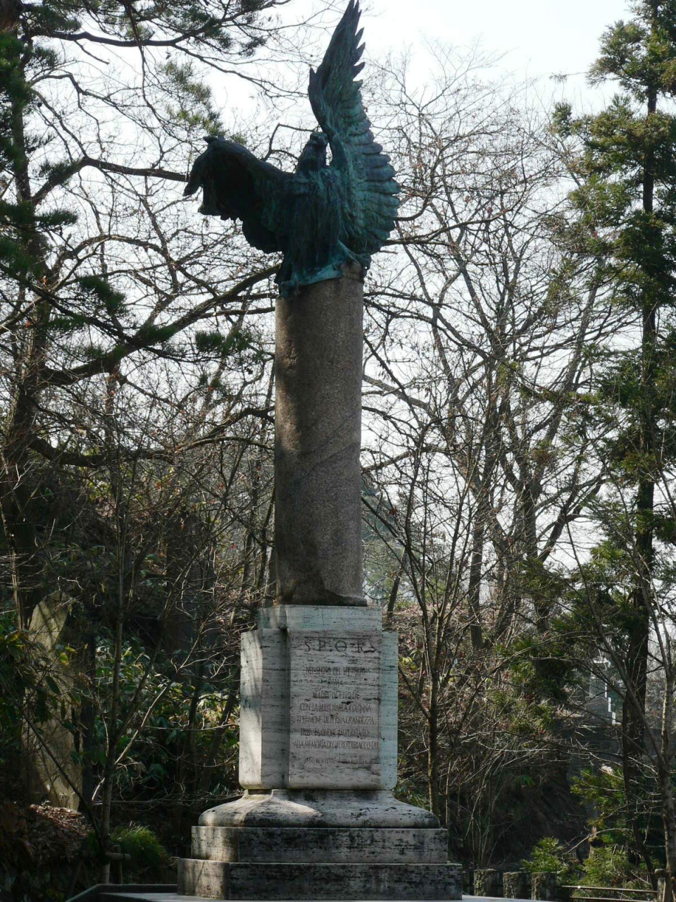 イタリアのローマ市は白虎隊の精神に深い感銘を受け昭和三年、ローマ市民の名をもって碑が贈られた。碑の円柱は、ベスビアス火山の噴火で埋没したポンペイの廃墟から発掘した古代宮殿の柱だそうだ。基石表面にイタリア語で「文明の母たるローマは、白虎隊勇士の遺烈に、不朽の敬意を捧げんがため古代ローマの権威を表すファシスタ党章の鉞(まさかり)を飾り、永遠偉大の証たる千年の古石柱を贈る」裏面に、「武士道の精神に捧ぐ」と刻まれてあったが、第二次世界大戦後、占領軍の命により削り取られている。