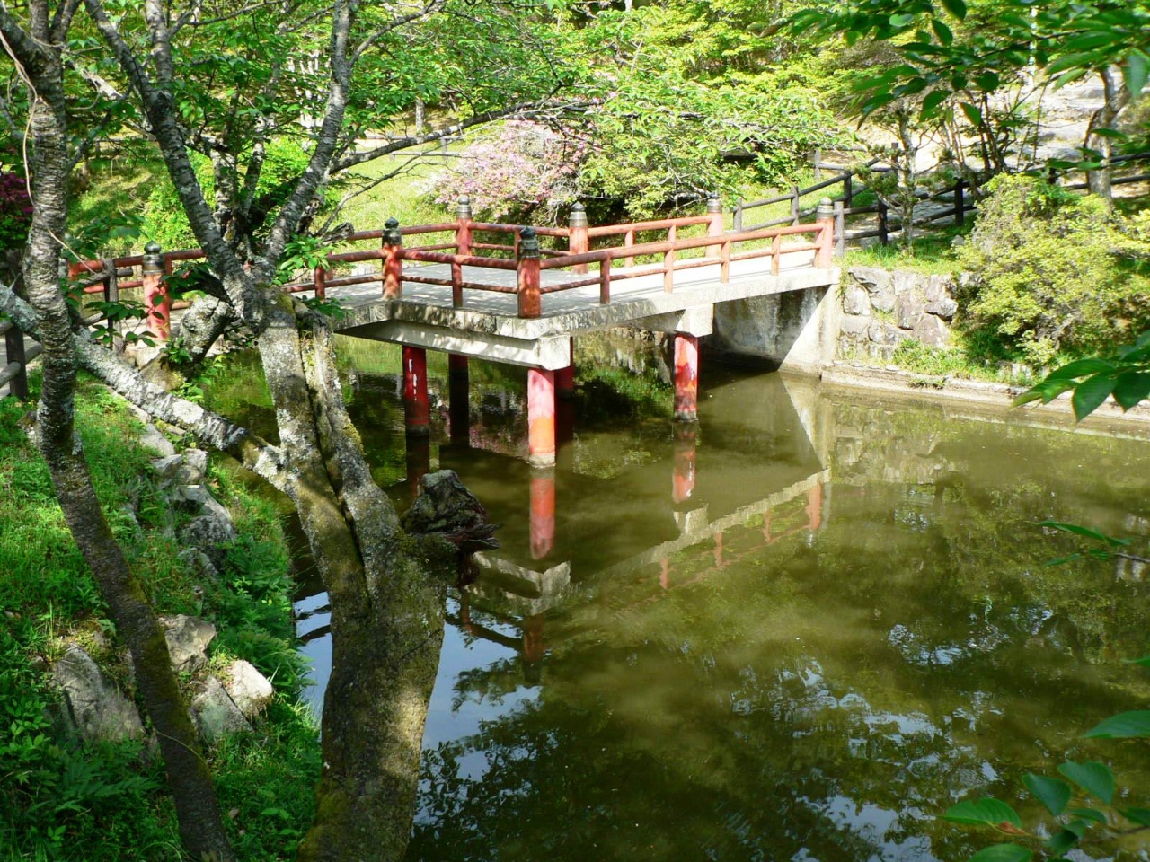 津藩第11代の藩主、藤堂高猷(とうどう たかゆき1813−1895年)が1859年につくった別荘「御山荘」(ござんそう)を起源とし、自然の起伏に池や橋、岩を配して回遊路がつけられている。四季の彩りが美しく、ツツジの名所とのこと。